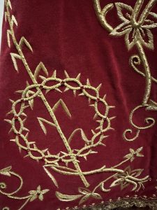Oferecida em 1984 pelo casal Diniz Manuel Gomes e Maria da Conceição Álvares Cabral Rebelo Gomes Soares, em cumprimento de uma promessa feita ao Senhor Santo Cristo dos Milagres aquando da doença do seu filho, ela simboliza assim um gesto de entrega e confiança que continua a ecoar na comunidade. Confeccionada em veludo e algodão, esta vistosa capa apresenta um desenho de inspiração vegetal, harmonioso e expressivo. O desenho e o bordado são da autoria da Irmã Maria Cruz Perez, então diretora da Casa de Trabalho de Vila Franca do Campo, sendo este o seu primeiro trabalho em capas para a imagem. A peça foi estreada nas Festas de 1984, integrando desde então o património devocional do Santuário.
