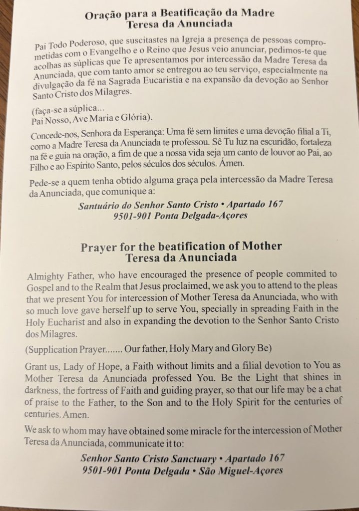 No final da celebração foi distribuída aos fiéis uma pagela com uma oração pela beatificação de Madre Teresa da Anunciada. O texto recorda a sua obediência à vontade divina, o serviço dedicado a Deus e a profunda devoção à Sagrada Eucaristia, dimensões espirituais que estiveram na base da expansão da devoção ao Senhor Santo Cristo.